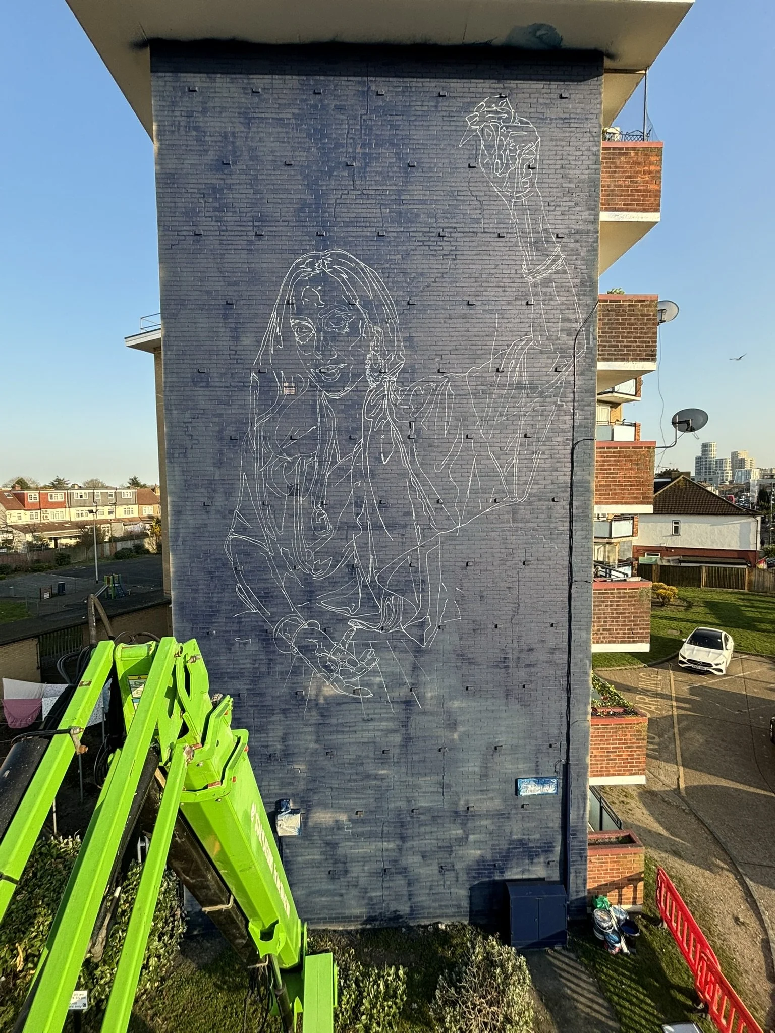 The mural site was the largest the artist had undertaken to date: a six-storey façade at the entrance to a residential estate and visible from a long distance down Ilford Lane. The scale demanded ambition, while the location required sensitivity to residents’ daily lives and access needs.